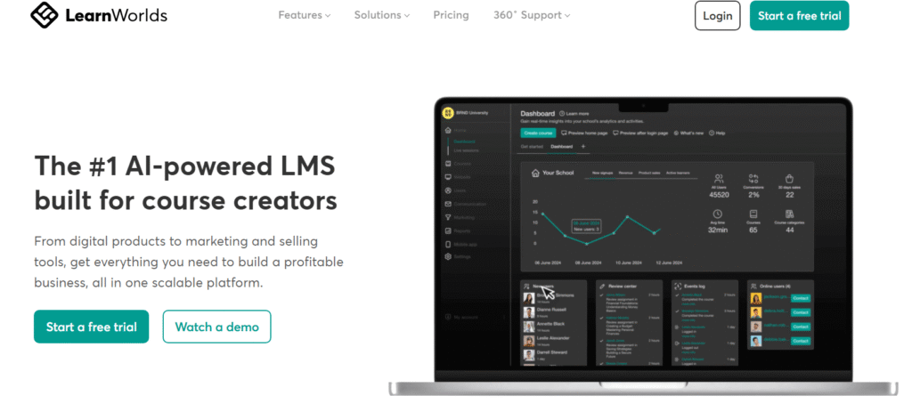 | 20. LearnWorlds | Course creators | From $29/month | ✅ | Branded online academies | 4.8/5 |