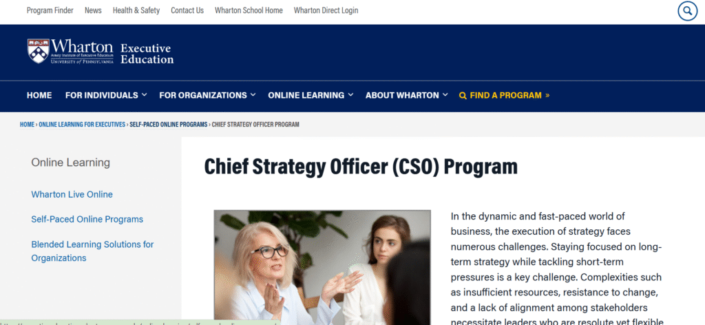 Wharton University’s Chief Strategy Officer (CSO) Program is a premier executive education course for senior leaders. This program equips participants with advanced strategic frameworks and tools to guide complex business strategy environments. Led by renowned Wharton faculty, it offers in-depth insights into strategic management, innovation, and organisational leadership.